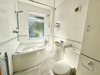 Fitted white three-piece suite comprising a corner bath with a separate shower over, fitted wash hand basin and a low-level flush WC. Tiled surround, radiator, laminate floor, extractor fan and opaque double-glazed window to the rear.