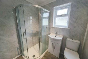 The bathroom has been recently updated with shower panelling to the walls, a walk-in shower, a toilet and a sink.