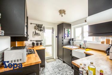 The property features a large driveway, accommodating 5 cars as you approach the front door. Stepping inside, you enter into a convenient porch area, which leads into the hallway finished with stunning wood parquet flooring. On the right, you'll find a downstairs WC and a new modern fitted kitchen. The kitchen features a mixture of base and wall units, finished in a stunning matte black. The contrasting solid wood worktops complete the look alongside the tiled mosaic floor. Plenty of storage space, a butler sink, and a mix of built in appliances including an electric oven, gas hob, fridge freezer and extractor fan make this well equipped space a fantastic versatile cooking space.