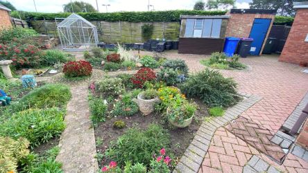A gated driveway leads to a detached single garage. The side garden is mainly block-paved with a range of planted beds and includes a greenhouse, brick-built and separate wooden shed. The rear garden is block-paved with raised bedded borders.