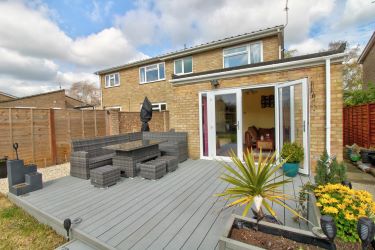 Rear Garden - Composite raised decked area, enclosed by paneled fencing, mainly laid to lawn, flower and shrub borders, outside lights, artificial grass area, pergola, door to garage.