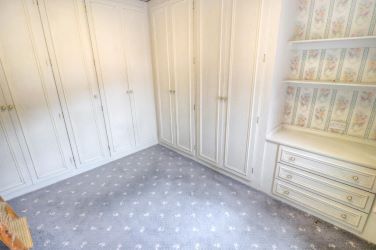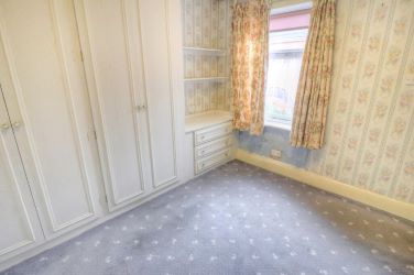 Two UPVC double glazed windows to the front, storage heater and a range of fitted wardrobes with storage cupboards over and fitted drawers