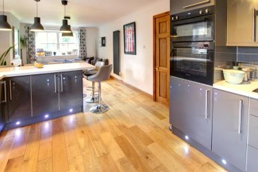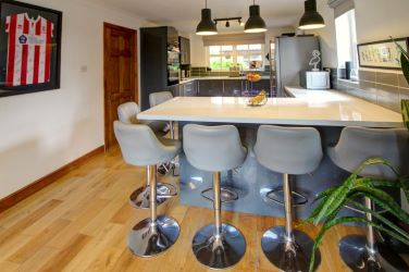 Kitchen / Breakfast and Living area - Dual aspect, newly fitted stylish grey kitchen with, sink, oven, inset lighting, opening to a breakfast bar and living area offering that highly desired open plan living.