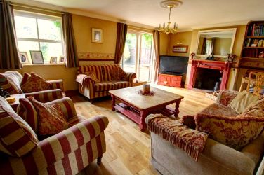 Lounge - large rear aspect lounge with open fireplace, patio doors.