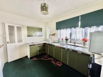 Two double glazed windows to the front, radiator, plug points, tiled surround, built in storage. A range of wall and base units with fitted worktop space and a double drainer stainless steel sink unit.
