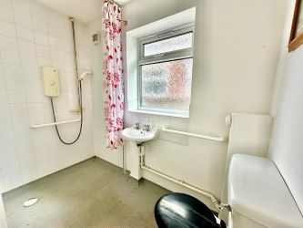 Walk-in wet room with electric shower, low level flush WC, wash hand basin, tiled surround, radiator and opaque double glazed side window.