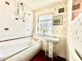 Fitted two piece suite comprising a panelled bath with electric shower over, pedestal wash basin, tiled surround, radiator, built in store cupboard and a double glazed window to the front.