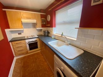 Kitchen 10'10" x 5'9" (3.3m x 1.75m). Double glazed uPVC window. Laminate tiled flooring, ceiling light. Roll top work surface, fitted wall and base units, single sink with drainer, integrated electric oven, integrated electric hob, overhead extractor, space for washing machine, dryer and fridge/freezer.