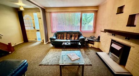 Open Plan Lounge: Entrance door, radiator, electric fire with brick surround, UPVC double glazed window to the front elevation, stairs rising to the first floor, wall mounted gas combi boiler and a storage cupboard.