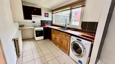 Kitchen: Fitted with a range of pine fronted base units and gloss fronted eye level units, tiled and alluminium sheet splash backs, individually designed worksurfaces with a wood and blue resin finish. Stainless steel sink unit and drainer. Tiled flooring, electric cooker, radiator, storage cupboard. Plumbing for a washing machine, UPVC double glazed window and door to the rear garden.