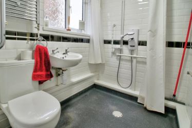 Wet room, Non slip flooring wall mounted shower close coupled WC and hand basin. Built in cupboard, heated towel rail, tiled walls, double glazed frosted window to side