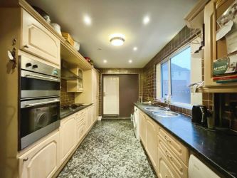 The kitchen is well-proportioned, offering ample cupboard space and work surfaces. A doorway leads into the rear conservatory, which has been partitioned into two separate storage areas, providing additional practicality.