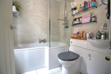 Bathroom/wc - Three piece white coloured bathroom suite comprising, vanity hand wash basin, low level wc, bath with a shower over and screen, heated towel rail, tiled floor, and walls, Double glazed window to the side