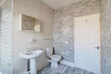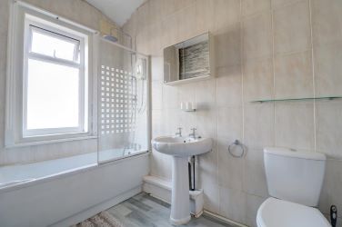 Bathroom - A three piece suite comprising of a low flush WC, pedestal wash hand basin and a panelled bath with electric shower over. A double glazed opaque window to the rear, vinyl flooring and a heated chrome towel radiator.