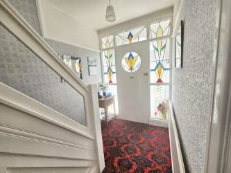 Hallway Door to front elevation, modesty stained inset panel and modesty stained windows to front elevation, stairs to first floor, understairs storage cupboard.
