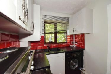 Located at the front of the property, this kitchen features a window to the front, a sink, an electric cooker, plumbing for a washing machine, and space for a fridge freezer.