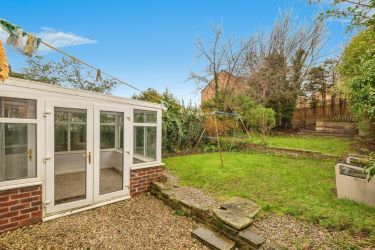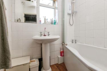 Fitted with a rectangular bath, triton shower, pedestal wash hand basin, part tiled, heated towel rail and double-glazed window to the rear aspect with obscure glass