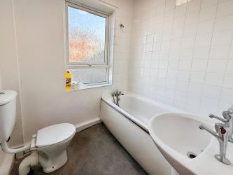 Located on the ground floor, the bathroom features a white suite comprising a panelled bath with overhead shower, wash basin, and WC. Frosted rear window for privacy and part-tiled walls.