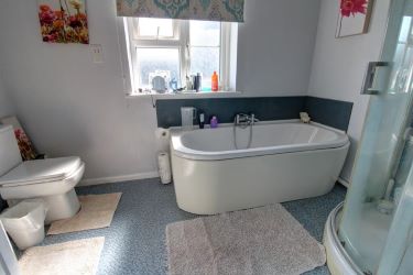 En-Suite - Window to rear, panelled bath, walk-in shower, low-level w/c, hand wash basin, radaitor.