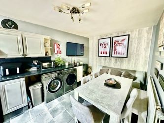 Fitted with a range of matching base and eye-level units and fitted contrasting worktop space, an inset stainless steel sink unit and a mixer tap, gas point and space for a cooker with fitted extractor fan, space and plumbing for a washing machine and dryer, space for a fridge/freezer. Laminate flooring, plug points, radiator, built-in storage and a double-glazed window.