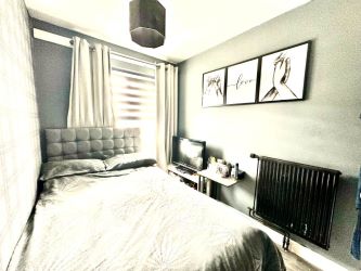 Laminate flooring, radiator, plug points, TV point, coved ceiling and UPVC French doors leading to the rear garden and two full-height glazed windows bringing in an abundance of natural light.