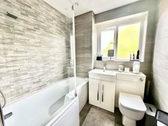 Refitted modern white three-piece suite comprising P-shaped panelled bath with mixer tap and a thermostatic mixer shower over with rainfall shower head and a glass screen. Fitted pedestal wash hand basin with mixer tap, low-level flush WC and vanity worktop space and a storage cupboard, panelled ceiling with spotlights, tiled floor and surround, ladder radiator and a frosted double glazed window.
