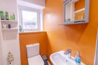 The generous size family bathroom consists of a four-piece suite comprising of a quadrant shower enclosure housing a mains shower with wet wall to this area, a wash hand basin and WC and separate bath with hot and cold tap. There is a rear facing opaqued window, a wall mounted mirrored cabinet and an Edinburgh press cupboard for linen and toiletry items.