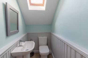 The WC comes with wood effect flooring, a two-piece suite, rear facing Velux window, wood panelling to dado height and a ceiling hatch to some loft space.