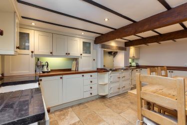 Kitchen Diner - Lovely spacious open plan room fitted with a range of matching modern wall and base units with wooden work surfaces, sink with mixer tap, space for appliances, flagged flooring, double cast iron electric aga (Everhot), integral dishwasher and ceiling beams.