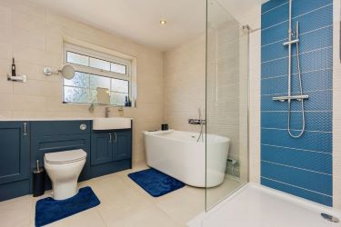 Family bathroom Modesty small paned effect double glazed window to rear elevation, free standing bath with shower attachment, vanity wash hand basin with storage below and mixer tap, low level W.C. shower area housing shower and screen, complementary tiling, heated towel rail, complementary tiling, tiled floor.