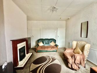 Coved ceiling and a large UPVC double-glazed bay window with a front outlook. A double bank radiator and multiple plug points service the room, and a removable fireplace provides a flexible focal point.