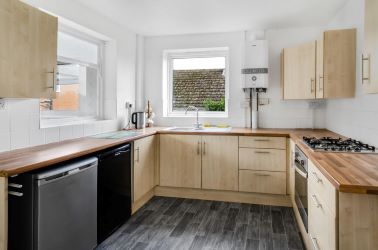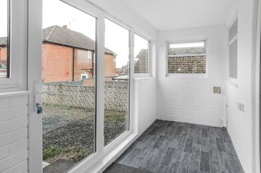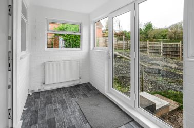 The front of the property is approached through an entrance door, which opens into a small yet practical porch. From here, you are immediately welcomed into a spacious and inviting hallway, which serves as the central hub of the home, connecting you to all main rooms and providing access to the loft room via a sturdy pull-down ladder. The living room, serving as the main reception area, boasts an impressive sense of space and light, thanks to its dual aspect windows at the front and side elevations, which allow plenty of natural daylight into the room and enhance the welcoming ambiance. This area is ideal for relaxing or entertaining. The kitchen, located adjacent to the living area, is fitted out with a selection of both wall-mounted and base units, offering ample storage and practical work surfaces. It also includes a modern inset sink with a drainer and swan neck mixer tap, positioned beneath a side-facing window that is complemented by a tiled splashback. Other notable features of the kitchen are a gas hob, an electric oven, and dedicated spaces for an under-counter fridge and freezer, while a wall-mounted combination boiler provides added convenience. A rear-facing window and door lead out from the kitchen to the sun/utility room, which provides a versatile, bright, and functional space. This room overlooks the rear garden and has direct access to it, making it ideal for additional household tasks and storage, with plumbing installed to accommodate a washing machine.