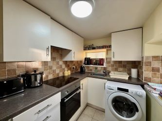 The kitchen is light and modern, fitted with a range of contemporary wall and base units, roll-edge work surfaces, and tiled splashbacks. There is an inset hob with oven and grill beneath, space for a washing machine and fridge/freezer, and a sink with mixer tap. A double glazed door opens directly onto the courtyard garden — ideal for seamless indoor-outdoor living.