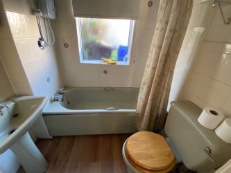Avocado three piece suite comprising panelled bath with electric shower over, wash hand basin, Lounge w level flush wc, tiled surround, radiator and frosted double glazed window to the rear.