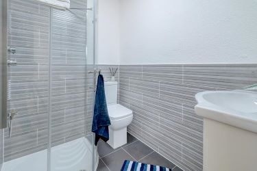 The property is entered into the spacious hallway with stairs to the first floor, wall mounted iPad for technology system access, high gloss porcelain floor tiling with doors to the Study, Kitchen/Dining Room, Wetroom and etched glass sliding doors through to the living room. The living room has windows to the rear and side, as well as triple doors giving access to the veranda and garden to the front. The study has a window to the rear and is large enough to have potential use as a bedroom. The ground floor wet room has been designed for disabled access with a striking blue resin poured floor, shower panel and vanity unit suite with inset wash hand basin and low-level WC.