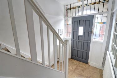 ENTRANCE HALLWAY – An entrance door with decorative windows. Wood effect tiled floor, central heating radiator.