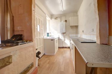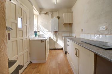 Kitchen - 2.6m x 1.9m Fitted base units with complementary work surface, sink with mixer tap, tiled to complement, space for appliances, wood effect flooring, wall mounted boiler, single glazed half bay window and door to the side.