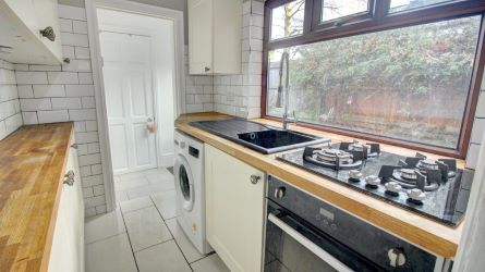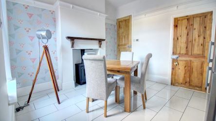 Beyond the short hallway is second generous reception room, the dining room. Again, there is a long burner set into a chimney breast to the right of the room, however this time there is sleek white tiling laid underfoot. There are a set of units mounted to the left wall and space for a Fridge-Freezer. To the rear of the dining room is a double-glazed window (all windows are double glazed in the house) beside a door to the kitchen.