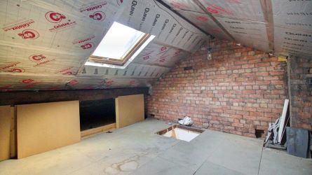 What appears to be a handy storage cupboard in the front bedroom is actually access to a fixed, thick wooden ladder leading up to a part-converted loft space. The flooring is boarded with clear segregated eaves storage and a large skylight / roof window.