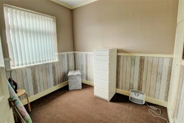 Staircase to the first floor landing where there is a side facing window and access to the loft. The master bedroom is slightly L shaped creating an ideal dressing area, front facing square bay window. Generous second bedroom with far reaching views to the rear. Family bathroom with white suite comprising of bath with shower above, wash hand basin and wc. PVC boards to the splashbacks, vinyl floor and opaque window.