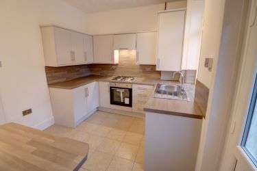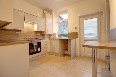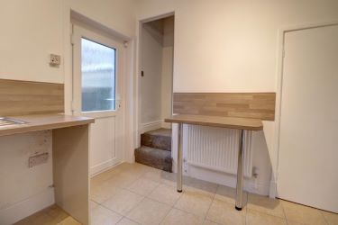 Dining Kitchen - Stunning newly fitted kitchen with a range of matching wall and base units with complementary work surfaces, sink with mixer tap, integral oven, hob and extraction hood, tiled to complement, tiled flooring, fitted boiler cupboard, radiator, fitted breakfast bar, uPVC double glazed window and door to the rear, under stairs storage cupboard and stairs to the first floor. 2.7m x 3.1m