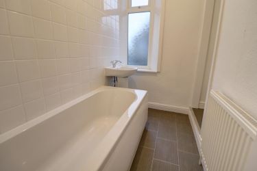 Bathroom - Modern and stylish three piece suite in white comprising toilet, sink and bath with shower over, tiled to complement, tile effect flooring, radiator and uPVC double glazed window to the rear.