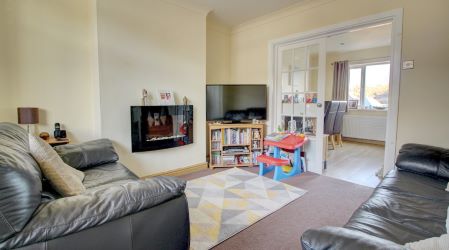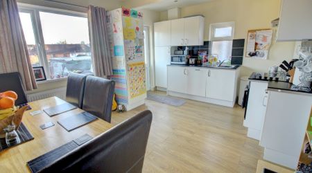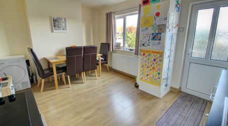 The kitchen stretches the full width of the house and features a wide area to the left of the room for dining. The flooring is of a high-quality, wood-effect laminate and there is a large window to the rear overlooking the garden, as well as a door to exit. The kitchen suite is modern and is fitted across two walls to the right of the room. It features a range of white units with a low-level electric oven and a four-ring electric hob. There is a smaller window position above the stainless stell kitchen sink and drainer and a handy storage cupboard that makes good use of the space under the staircase.