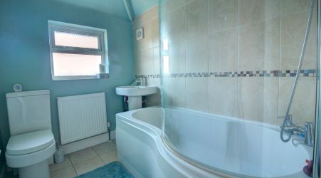 Moving upstairs, the landing area has doors leading off to all both bedrooms and a stylish family bathroom. The suite for the bathroom includes a large P-shaped bathtub with a shower and curved screen fitted above. There is also a wash hand basin, toilet and smart tiling to the splashback areas. Both bedrooms are generous double rooms with the larger of the two being at the front and both featuring a chimney breast. To the front of the master bedroom is a large storage room that was part converted into an en suite shower room. The plumbing is still in place however there are currently no fittings.