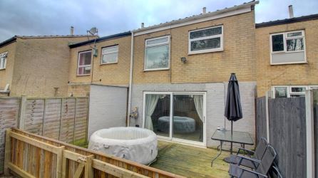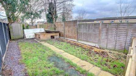 Finishing outside, the rear garden features a decking area and long lawn. The decking area is built close to the house with a short fence with gate leading through to the main lawn. A path leads through the centre of the lawn down to the end where there is a wooden shed and brick wall boundary.