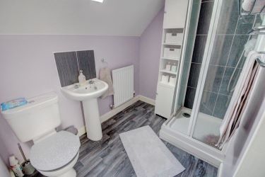 To the second floor the master bedroom with feature sloping ceiling into the roof space, window overlooking the front aspect, hanging rails, and access to the ensuite shower room with enclosed shower cubicle , hand wash basin and wc. vinyl flooring.