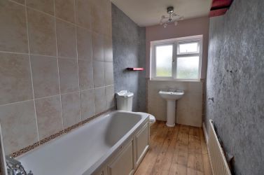 Panelled bath with mixer taps, low level WC and wash hand basin with double glazed UPVC window to rear aspect and a wall mounted radiator.