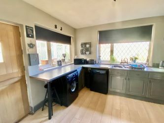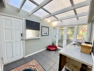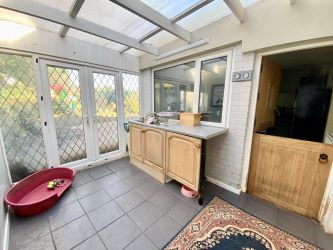 A side door leads to the driveway, polycarbonate roof, tiled floor, fitted worktop space with inset sink unit and fitted base units. Additional space for white goods, double glazed window to the side, two double glazed windows to the rear and French doors leading to the rear garden.