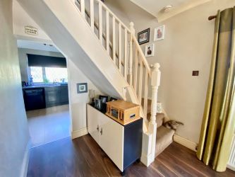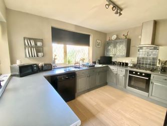 Fitted with a range of base and eye level units, inset 1.5 stainless steel sink unit with fitted worktop space, plumbing and space for a washing machine and dishwasher. Built-in four ring inset gas living flame effect fire in surround hob with stainless steel splashback and extractor fan over, built-in electric oven and grill, space for a fridge/freezer, wall-mounted and concealed combi boiler, compact breakfast bar area, double glazed window to the rear and side, laminate floor and a stable door leads to: