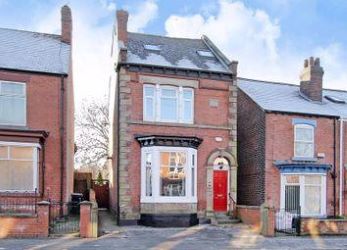 A stunning 4 double bedroom detached family home with 2 bathrooms, 2 reception rooms, separate WC and great family garden, enclosed and south-facing. Many period features throughout and a great size property on Handsworth Hill, S9. The solid wooden front door opens into the porch with tiled floor and walls, the original stained glass door opens into the spacious entrance hallway with solid wood polished flooring. A wooden glazed door opens into the generously sized living room with high ceilings, feature fireplace with tiled hearth and insert with a living flame coal effect gas fire inset and a wooden surround and wooden flooring. There is a feature wall with library wallpaper and a bay window allowing plenty of natural light into the room. From the hallway, a further door opens into the dining room which has a beautiful stained glass feature window, solid wooden flooring and complementary decor. A door opens into the off-shot kitchen which has a good range of grey floor and wall units including a larder cupboard, black wooden worktops, mosaic and white tiled walls, grey tiled floor, an integrated fridge freezer, space and plumbing for a washing machine and space for a range cooker (which may be available by separate negotiation). The boiler is housed in the kitchen. The side door opens into the rear porch which has a breakfast bar and grey tiled flooring and a door that opens into the garden to the rear. From the kitchen, a door opens into the cellar which offers useful storage space. From the hallway, stairs, carpeted in grey rise to the first-floor landing. There is a separate WC with sink and grey tiling and a high-level window into the bathroom allowing for extra light. The family bathroom has a white suite, bath with shower over, separate shower cubicle, fashionable round sink set on a wooden shelf, WC, grey tiling and a grey towel radiator. There is a cupboard that houses the hot water tank providing extra storage space. The rear-facing double bedroom is a spacious, bright and airy room with a garden view and a grey carpet. The master bedroom is front-facing and has a good range of wall to wall, floor to ceiling wardrobes in white with some mirrored doors, 3 front-facing windows allowing for plenty of light, a grey carpet and nice decor. From the landing, further stairs rise to the 2nd floor, recently converted attic bedrooms and second bathroom. There is a reading nook on the landing which has a Velux window and an exposed wooden beam. The front and rear-facing double bedrooms both have an exposed beam, Velux window and a grey carpet and are bright and airy. The shower room has a shower cubicle with an electric shower, glass shower screen, white high gloss wall tiles and mosaic floor tiles with WC, sink and chrome towel radiator. Outside; To the rear is an enclosed south facing garden with patio area, pebbled border, outdoor WC and outhouse providing storage. There is a good-sized lawn with borders for planting and a raised area to the rear of the garden with a mature tree. There is a secure gate providing access from the side of the property. To the front is a block paved hard standing. Main Road is well placed for access to a range of local amenities and is a short drive away from Meadowhall Retail Park and Shopping Centre and has good transport links into the city centre and provides easy access to the motorway.